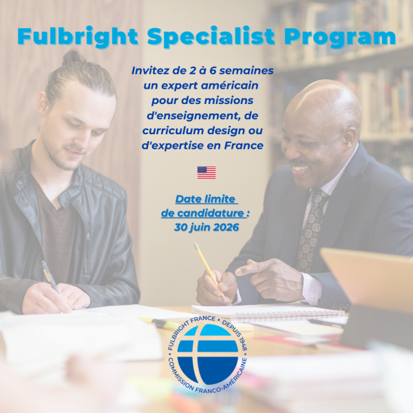 Invitez en France un expert américain de 2 à 6 semaines pour des missions d'enseignement, de curriculum design ou d'expertise dans le cadre de notre "Fulbright Specialist Program" ! De 1 à 5 bourse(s)